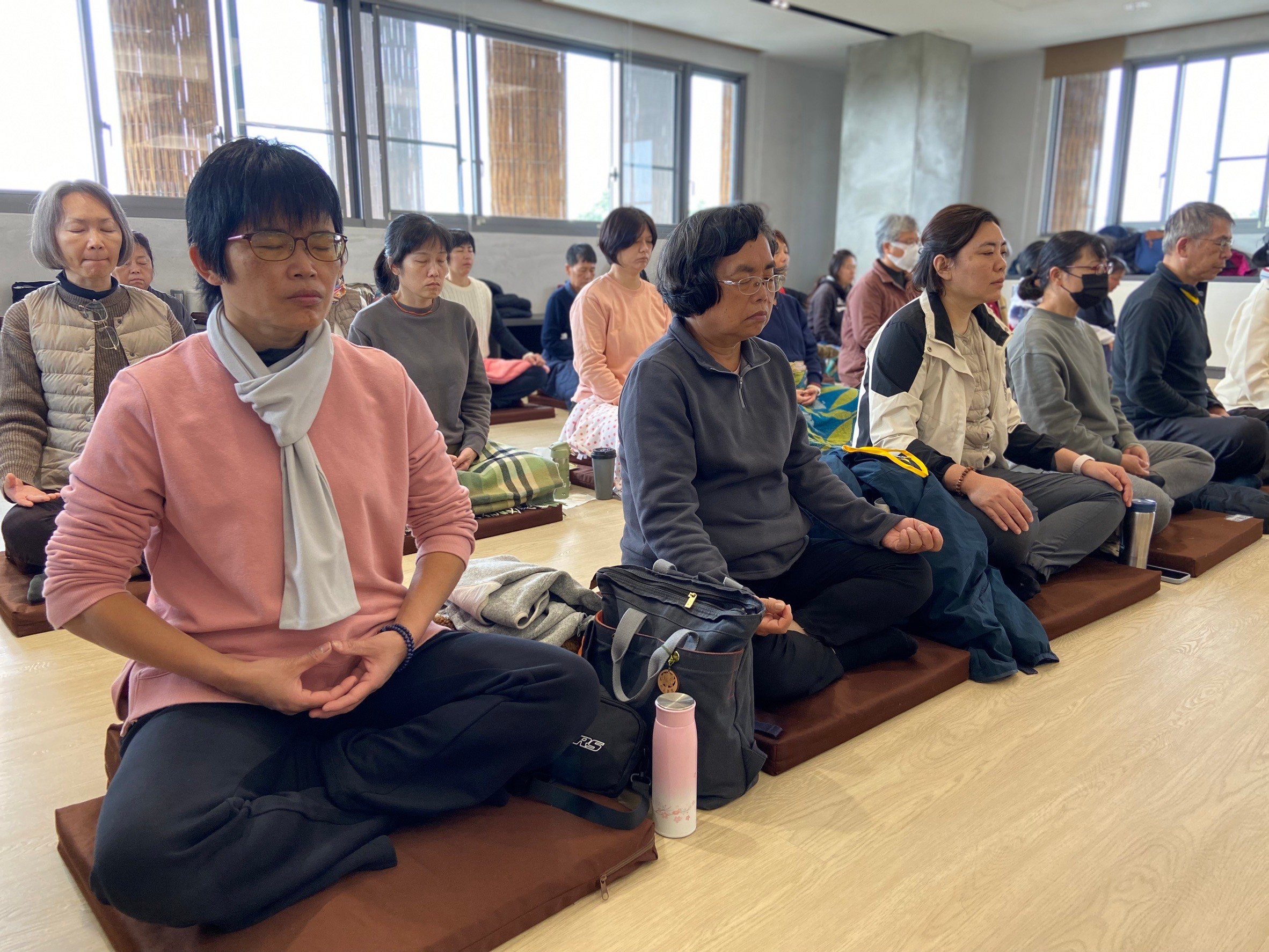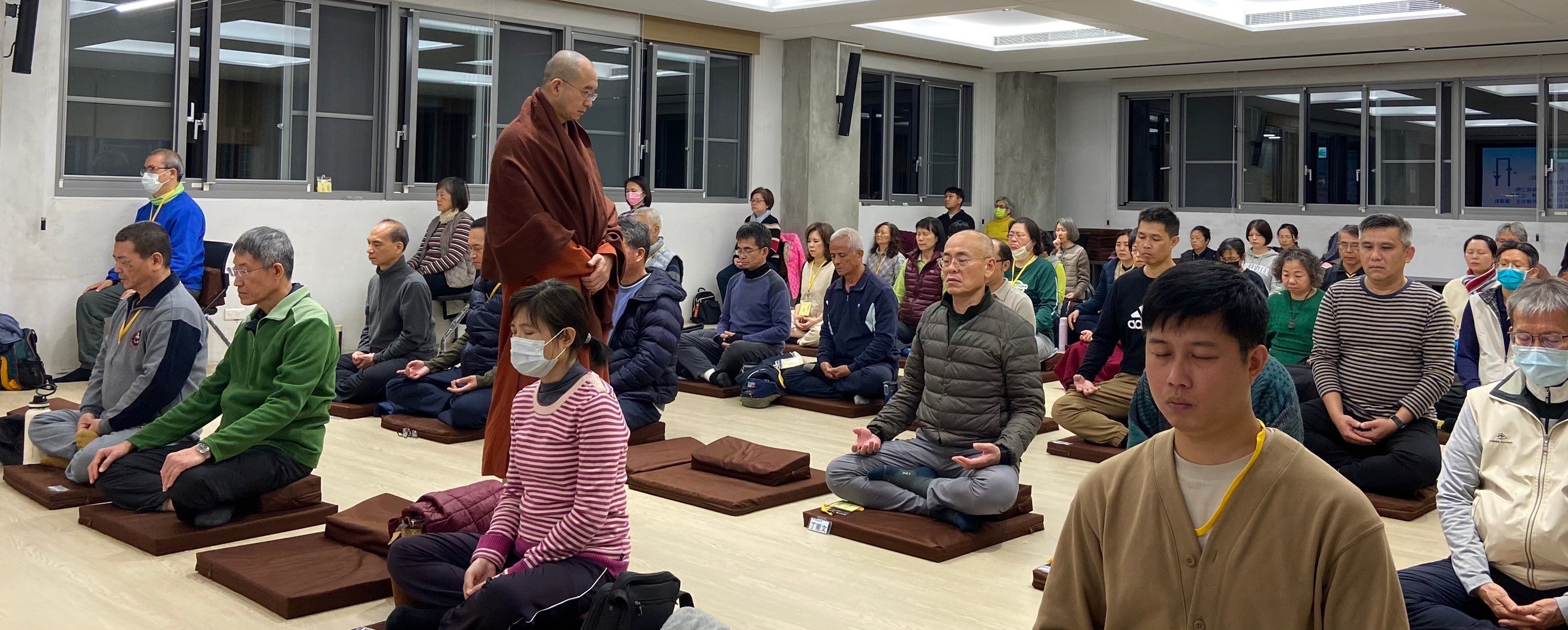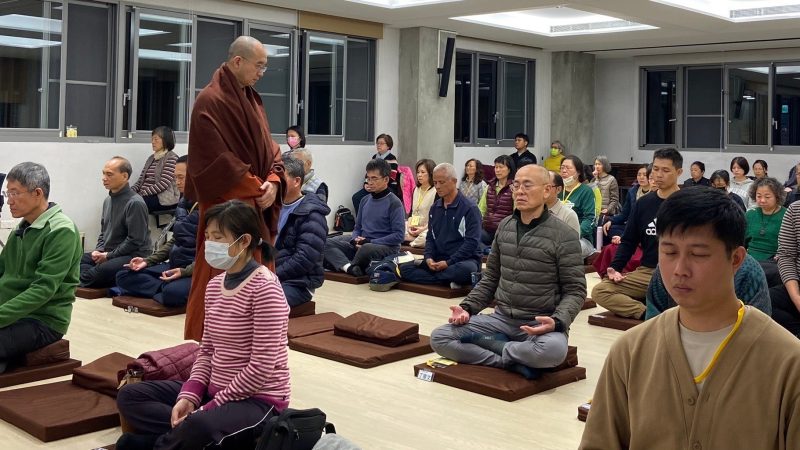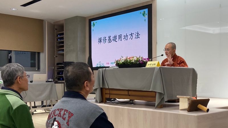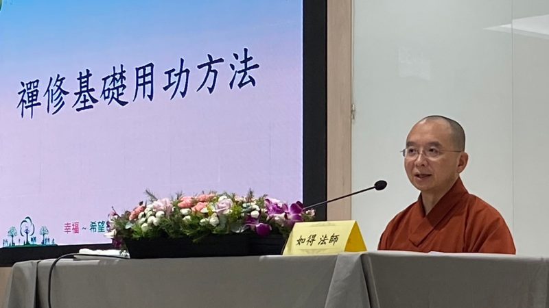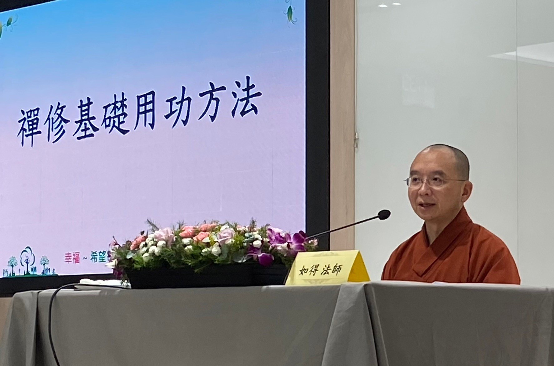 如得法師教授禪修基礎用功方法,細緻講解從身威儀到呼吸調息、如何克服腰痠腿麻,配合拜繞坐實地用功,引導學員慢下來、拉回來,進入專注放鬆身心狀態。