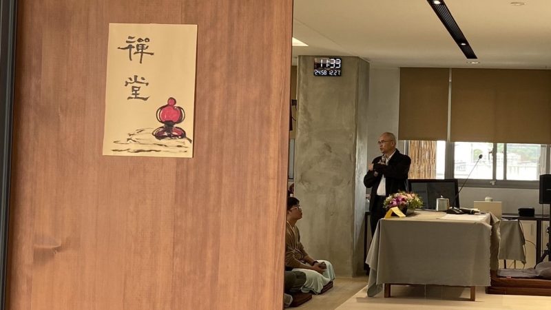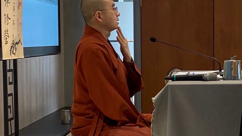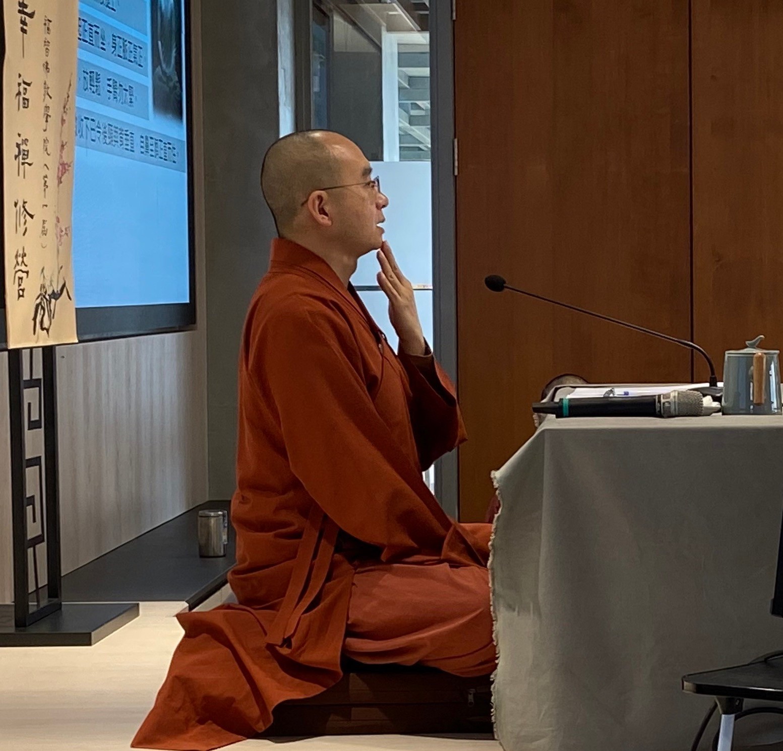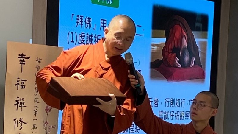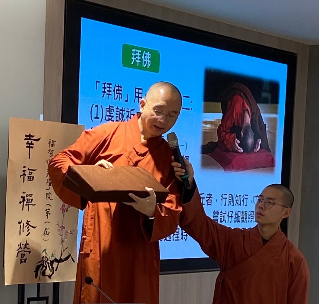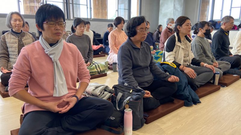 如得法師教授禪修基礎用功方法,細緻講解從身威儀到呼吸調息、如何克服腰痠腿麻,配合拜繞坐實地用功,引導學員慢下來、拉回來,進入專注放鬆身心狀態。