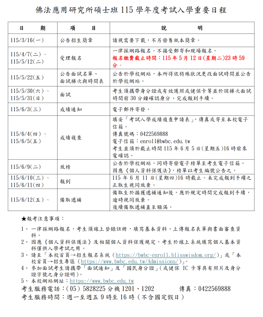 enroll@bwbc.edu.tw 招生相關問題諮詢