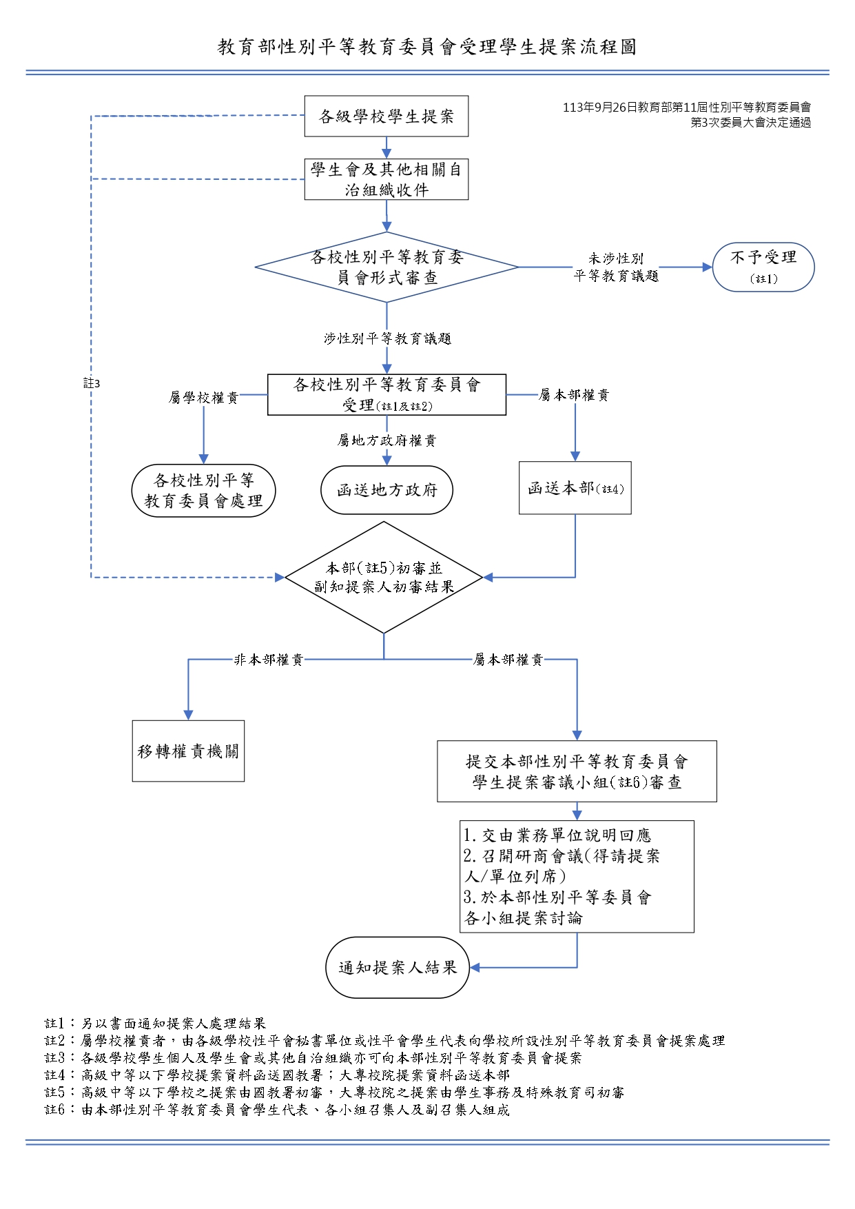 下載 Download is available until [expire_date] Version 下載 1 File Size 27.53 KB File Count 1 建立日期 2025-11-07 最後更新 2025-11-07 一、依據本部第11屆性別平等教育委員會第3次委員大會會議決議辦理。 二、115年受理時間及說明如下: 第1次受理收件截止日為115年3月16日(星期一); 第2次受理收件截止115年9月15日(星期二),以送達本部時間計算。 三、檢附教育部相關附件「教育部性別平等教育委員會受理學生個人提案單」。 【教育部】性別平等教育委員會115年學生提案受理機制