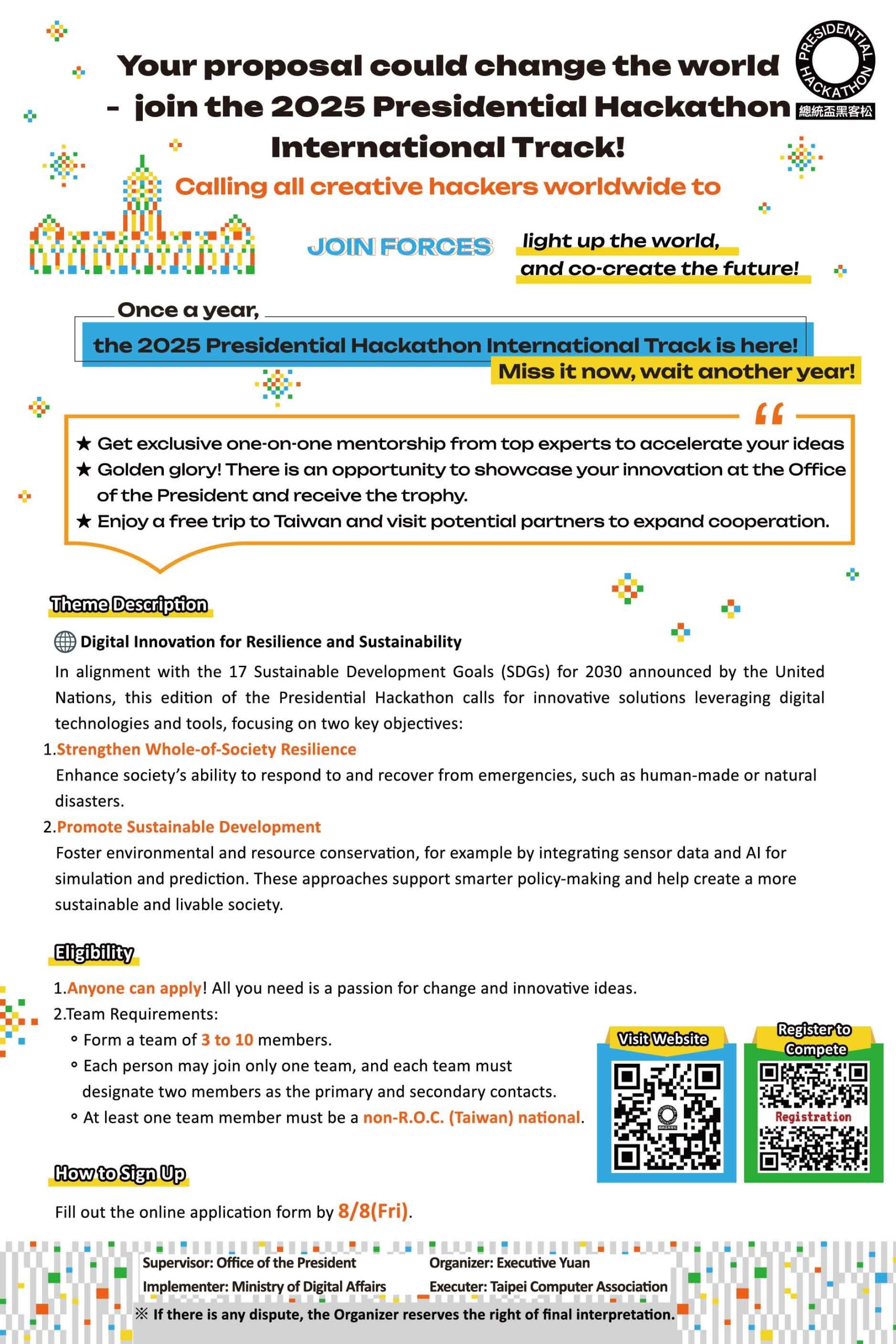 一、為因應國家社會發展需求,展現政府對開放資料與資料運用創新之重視,「2025總統盃黑客松」由總統府指導,行政院主辦,數位發展部承辦國際松競賽,由各界針對國際性共通議題,提出科技與創新解決方案。