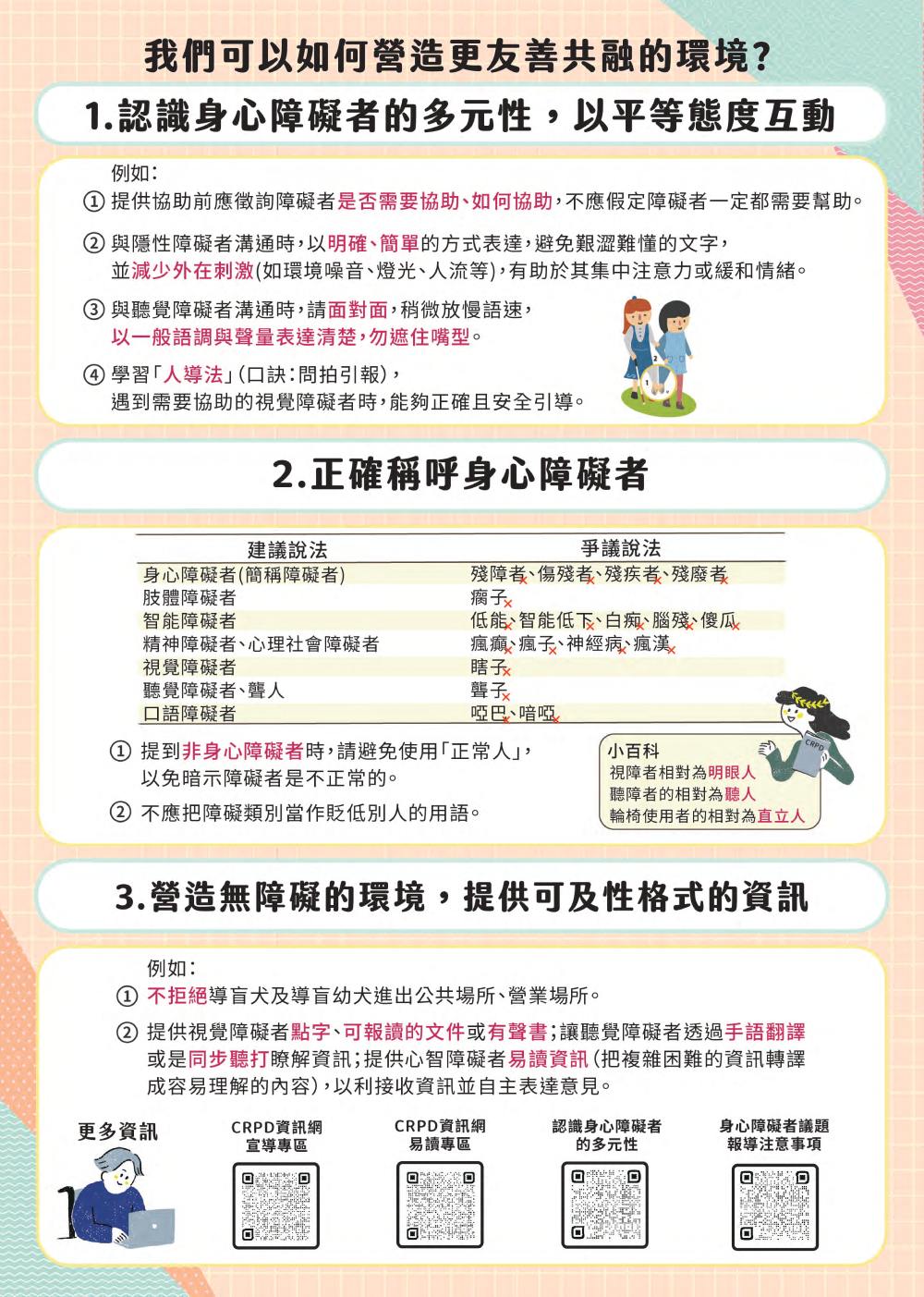 二、為促進身心障礙者與非身心障礙者有同等的權利,我國於 2014年透過CRPD施行法,期待透過公私部門的共同努力, 營造更友善共融的社會環境;衛生福利部製作旨揭宣導摺頁,介紹CRPD的八大原則,以及簡介社會大眾如何共同營 造更友善共融的環境,包含認識身心障礙者的多元性,以平等態度互動、正確稱呼身心障礙者、營造無障礙的環境,提供可及性格式的資訊等。
