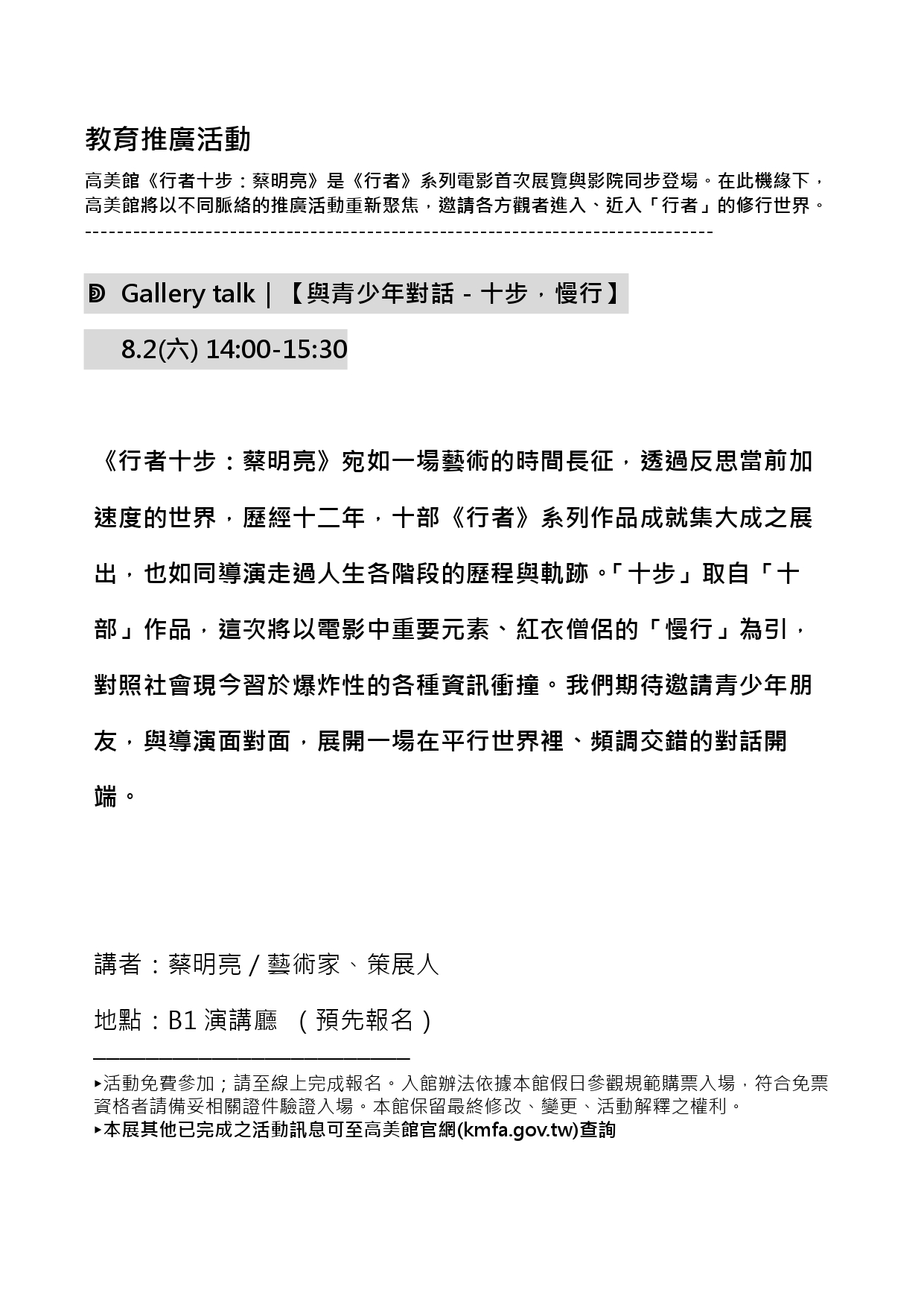 三、 「與青少年對話-十步,慢行」跨域講座,活動日期為8月2日(六),辦理時間為14:00-15:30,地點於高美館地下演講廳;講座免費參加,參觀《行者十步:蔡明亮》請依據本館參觀規範購票入場,符合免票資格者請備妥相關證件驗證入場。
